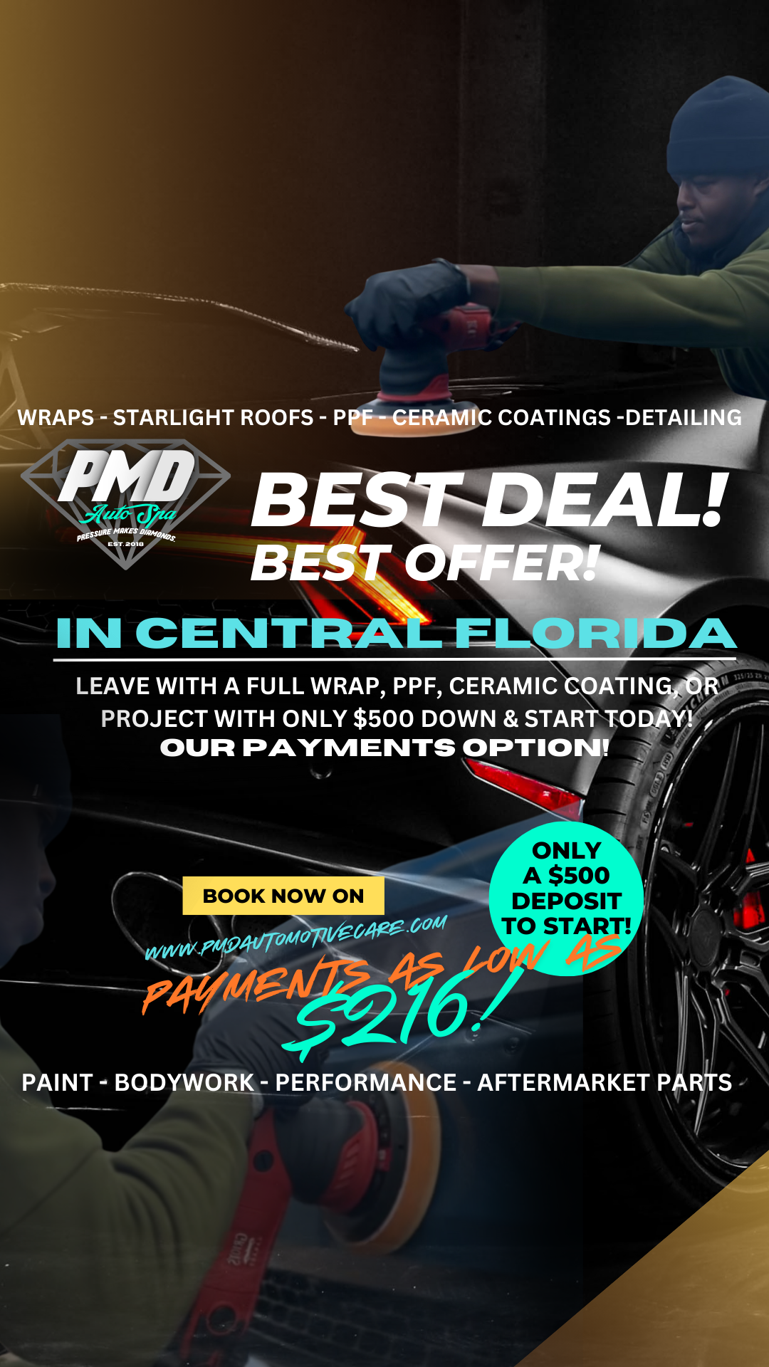 WHETHER YOU’RE LOOKING TO ELEVATE YOUR CAR’S STYLE, PROTECT ITS FINISH, OR CREATE A TRULY STANDOUT LOOK, WE ARE HERE TO GUIDE YOU THROUGH THE PROCESS. OUR TEAM HERE AT PMD WILL WORK CLOSELY WITH YOU TO UNDERSTAND YOUR VISION AND HANDLE EACH STEP OF THE PROJECT WITH PRECISION AND CARE. SERVING THE CENTRAL FLORIDA AREA, WE ARE PASSIONATE ABOUT MAKING YOUR AUTOMOTIVE DREAMS A REALITY!”
